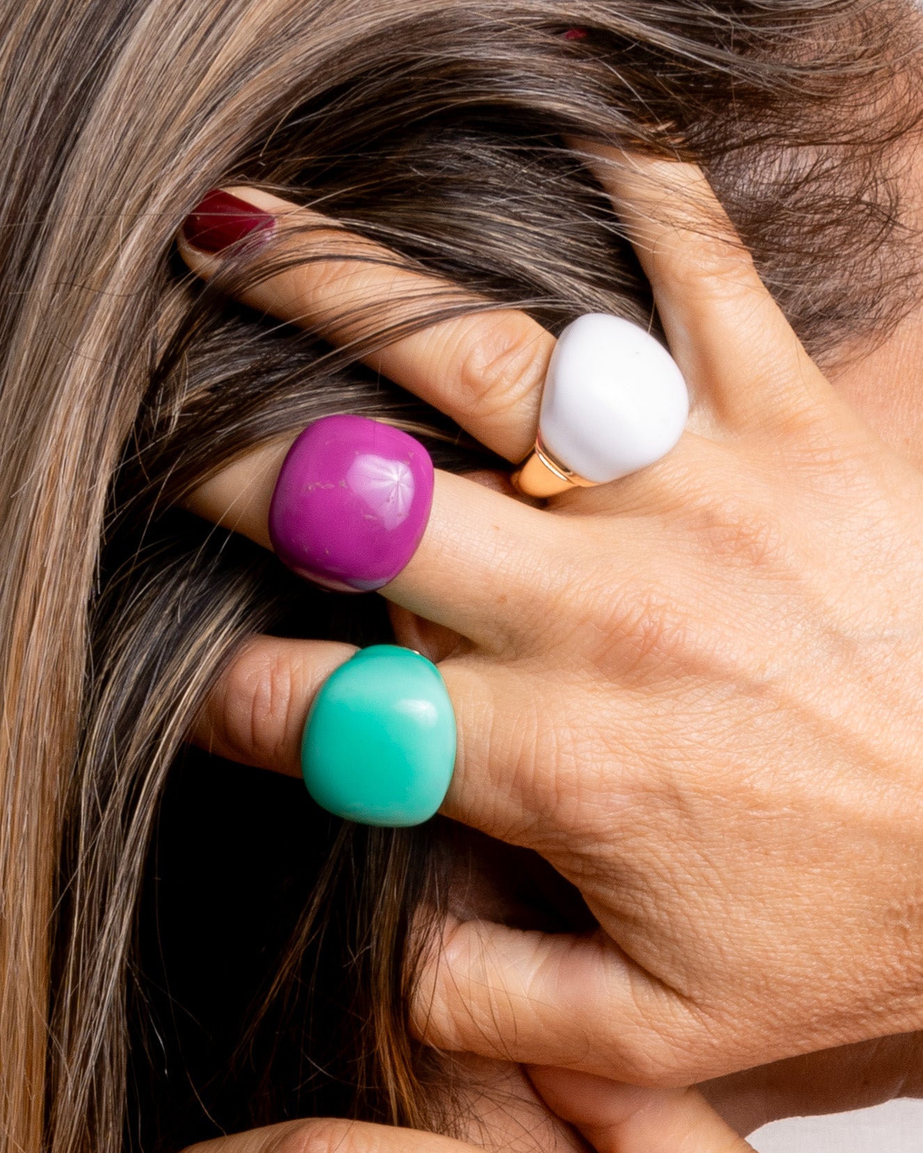 An enameled metal ring composed of four pieces joined together with an elastic band inside, allowing it to comfortably fit different finger sizes.