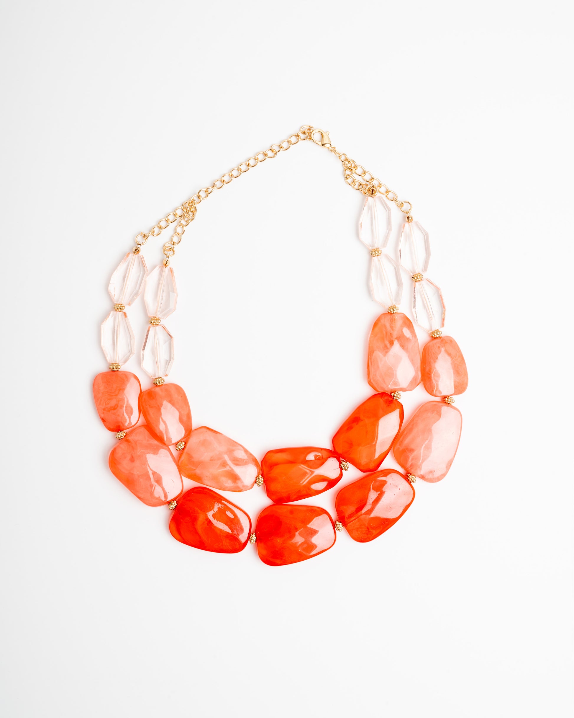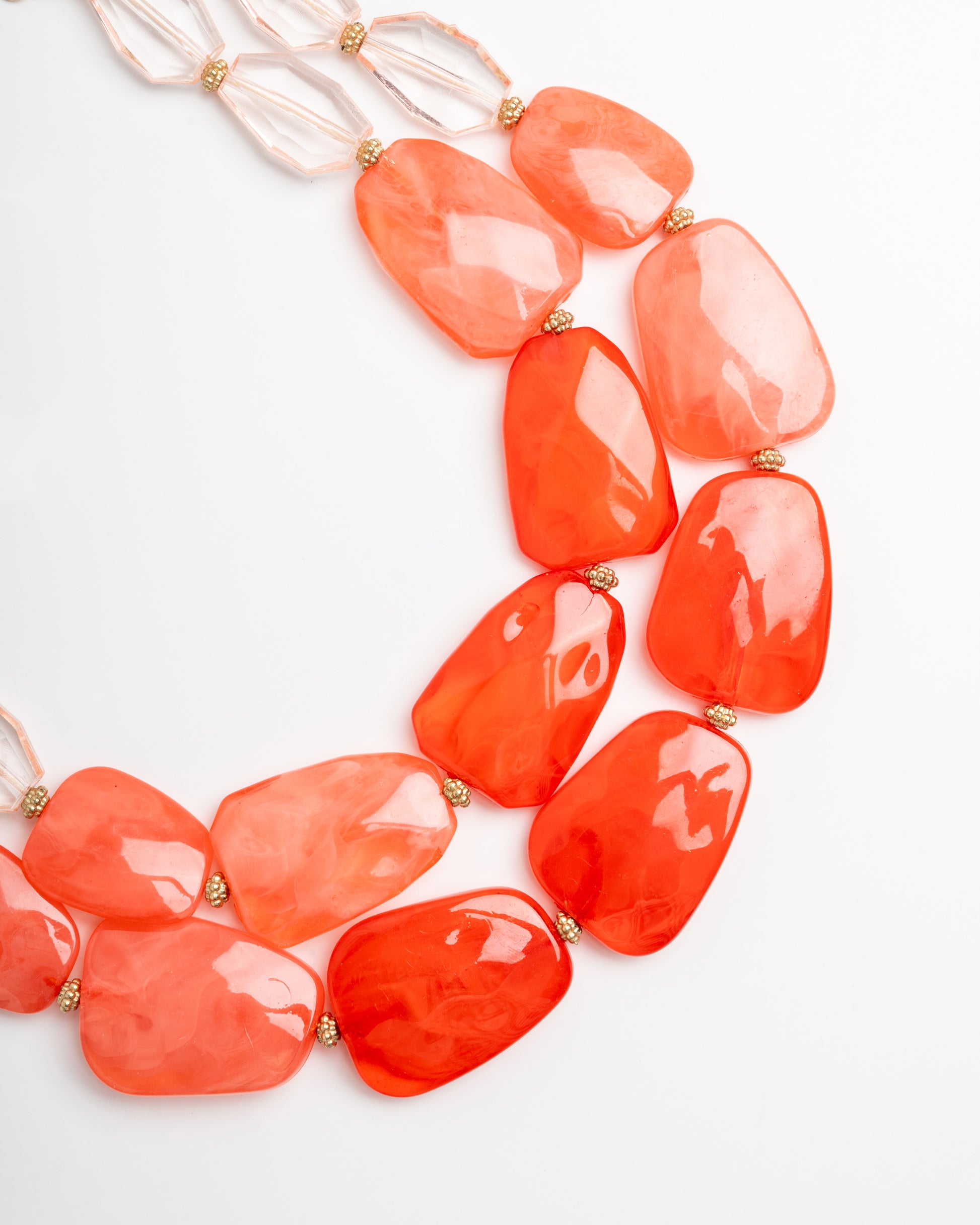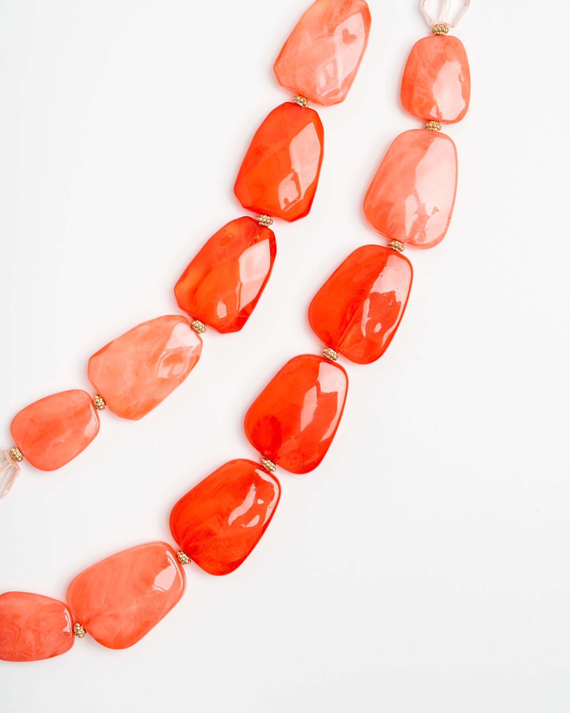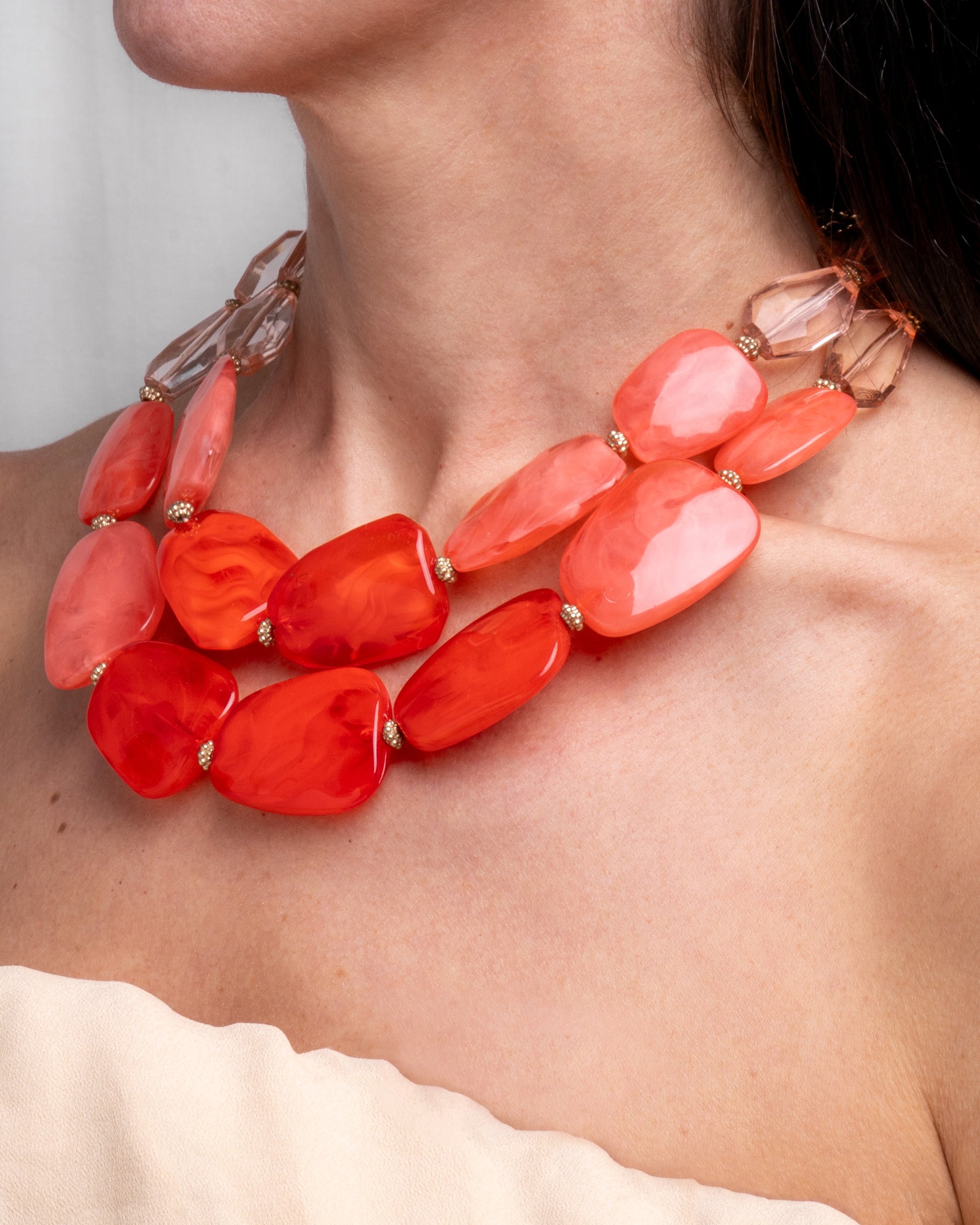 Diseño de impacto con cuentas irregulares de gran tamaño en acabado translúcido. Combina tonos cálidos y formas orgánicas con detalles dorados que realzan su volumen. Un collar con presencia, pensado para destacar por sí solo.
