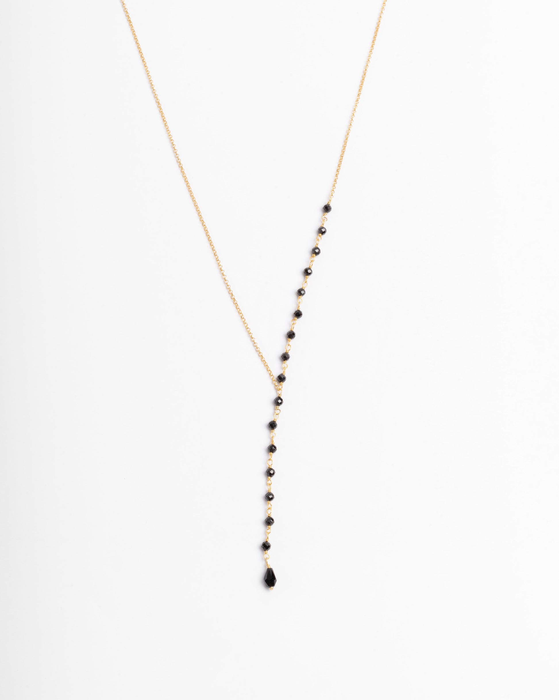 Collar tipo corbata con un diseño asimétrico: una mitad en cadena fina y la otra con minerales engarzados en negro. Contraste elegante y muy favorecedor.
