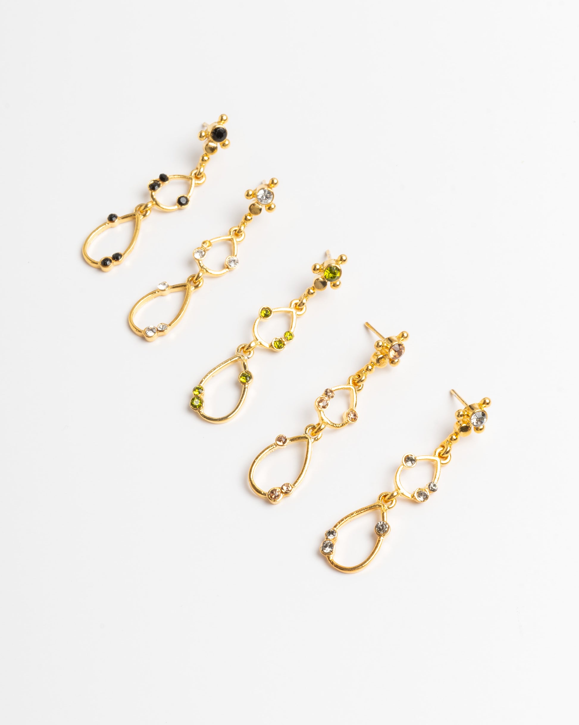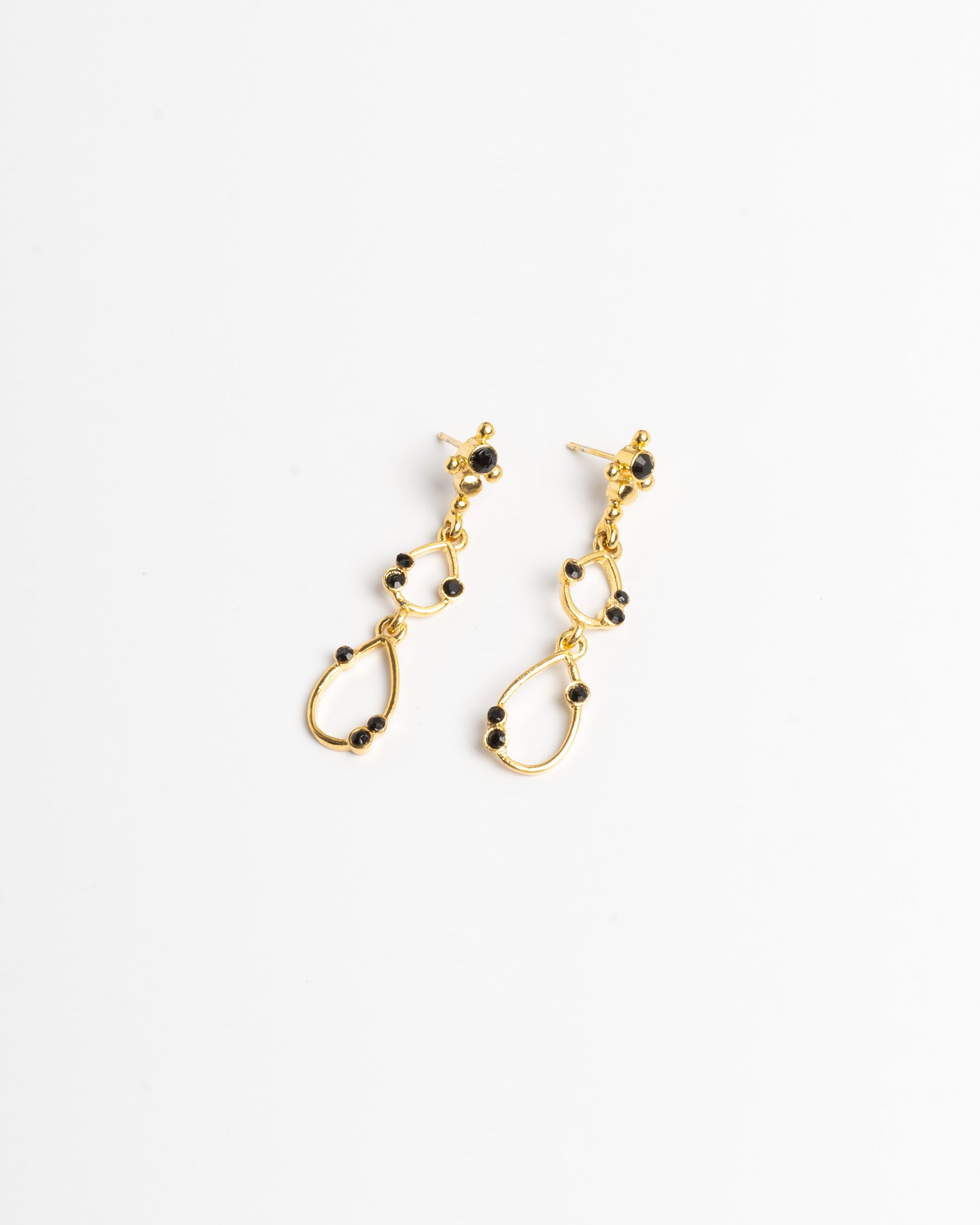 Pendientes articulados chapados en oro de 24 k, con cristales de Swarovski en color negro. Diseño con movimiento y acabado brillante.