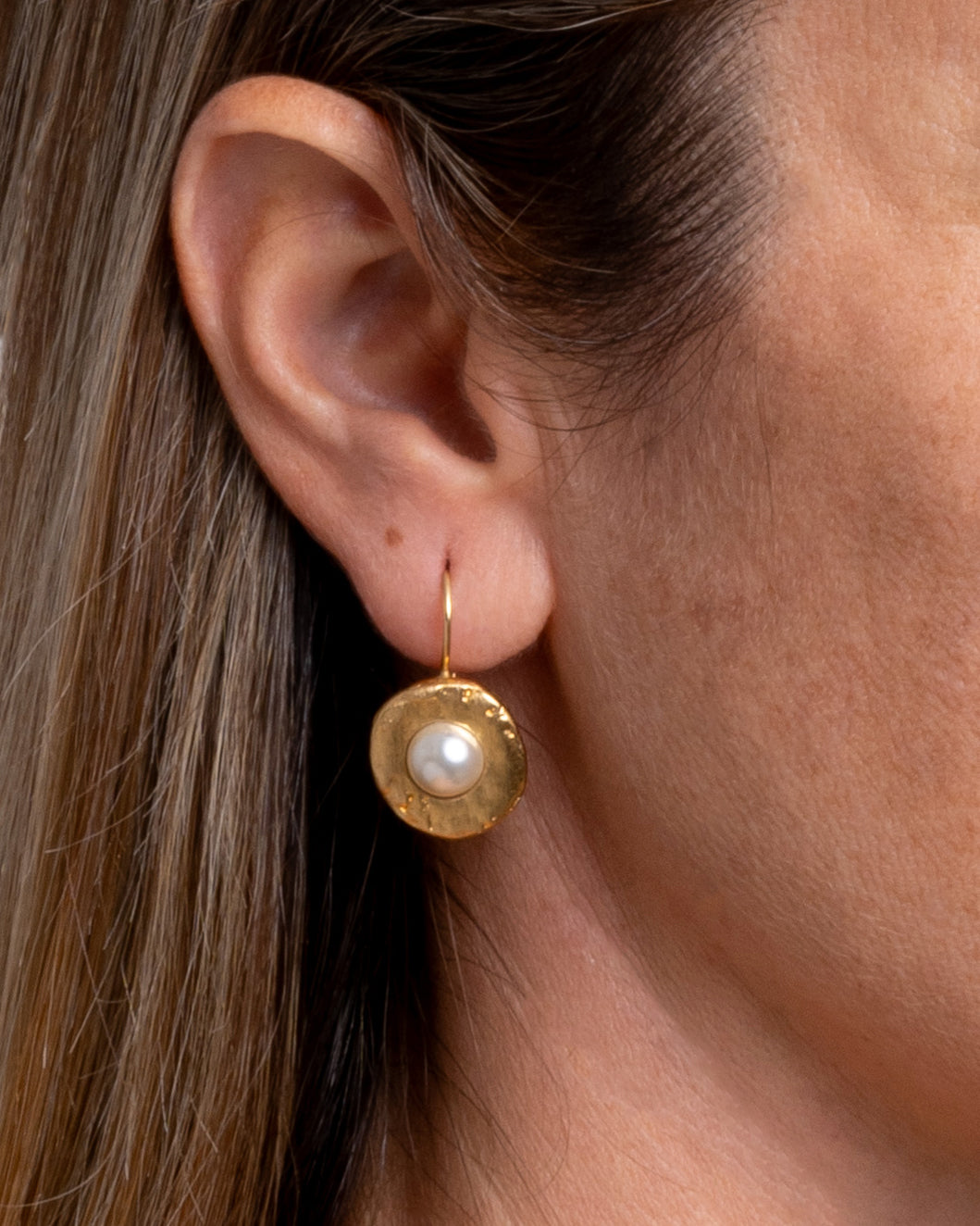 Pendientes de bronce con baño de oro de 24 kt, perla de cristal nacarado y opción de botón o colgante.