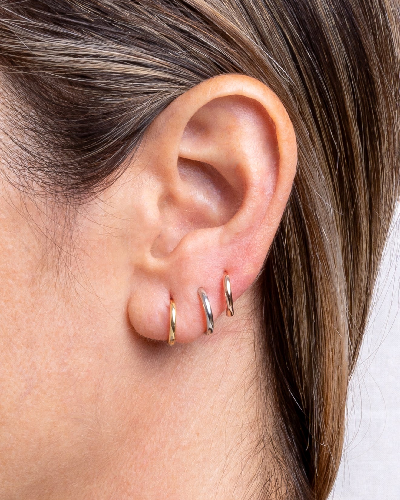 Diseño liso y atemporal, pensado para todos. Cierre de clic fácil y seguro. Muy cómodos y perfectos también para piercings. Disponible en plata o plata chapada en oro. Se venden por unidad o en pareja.