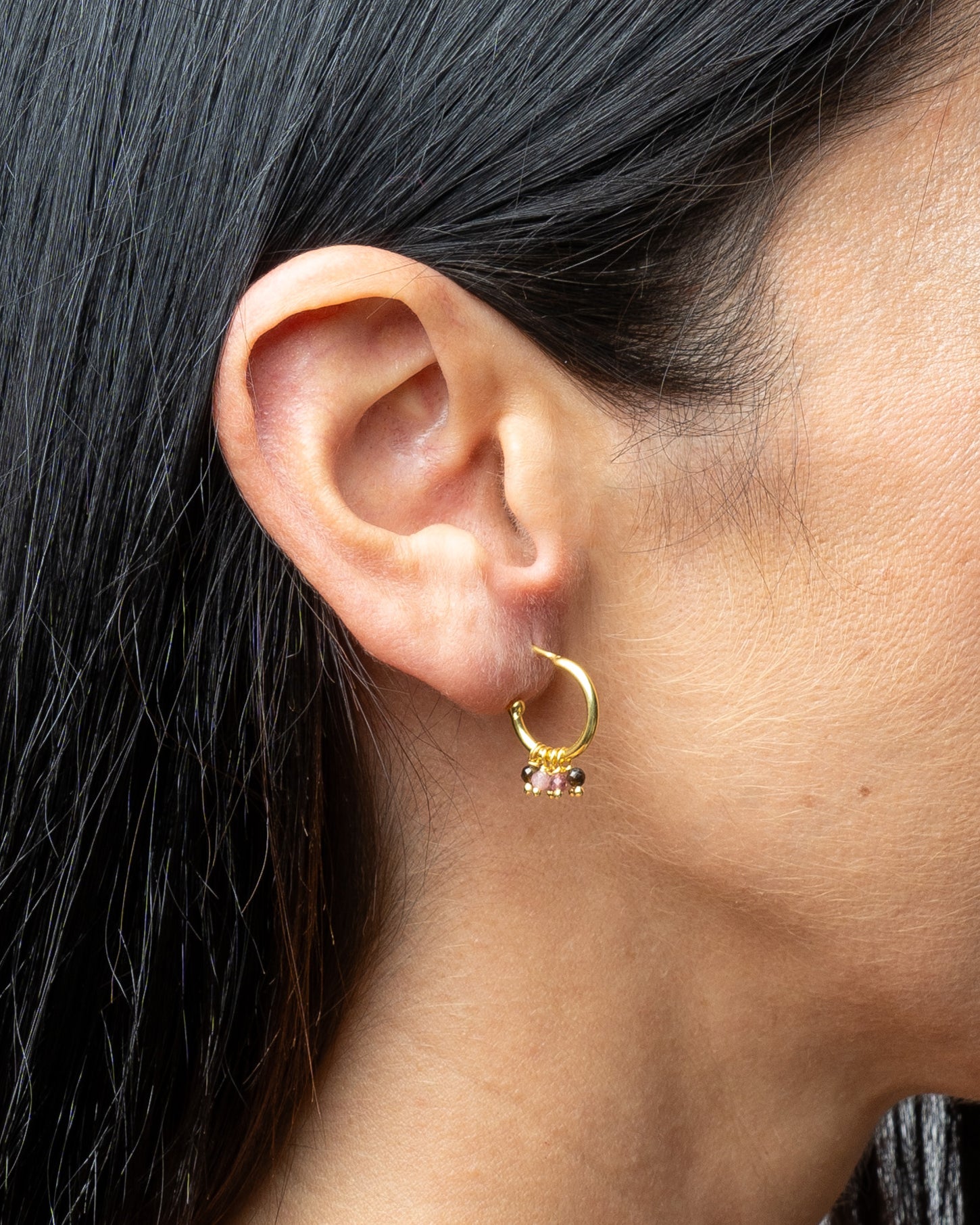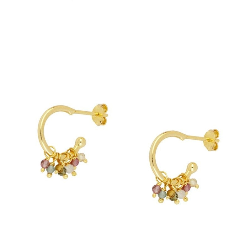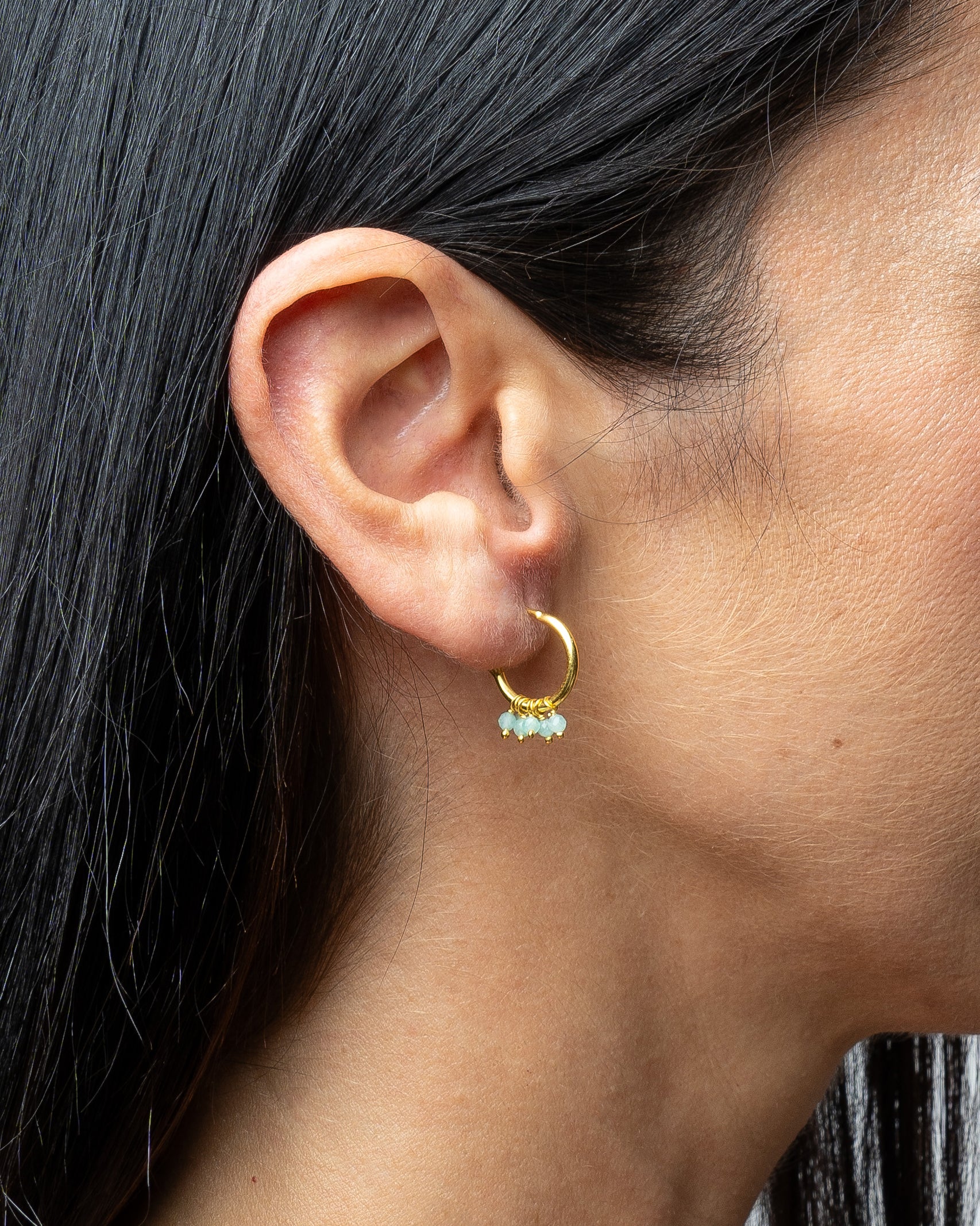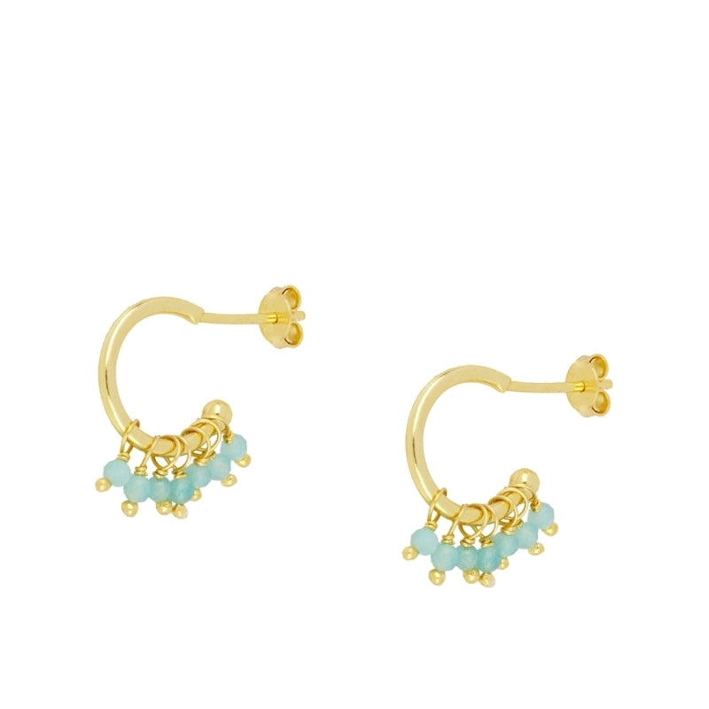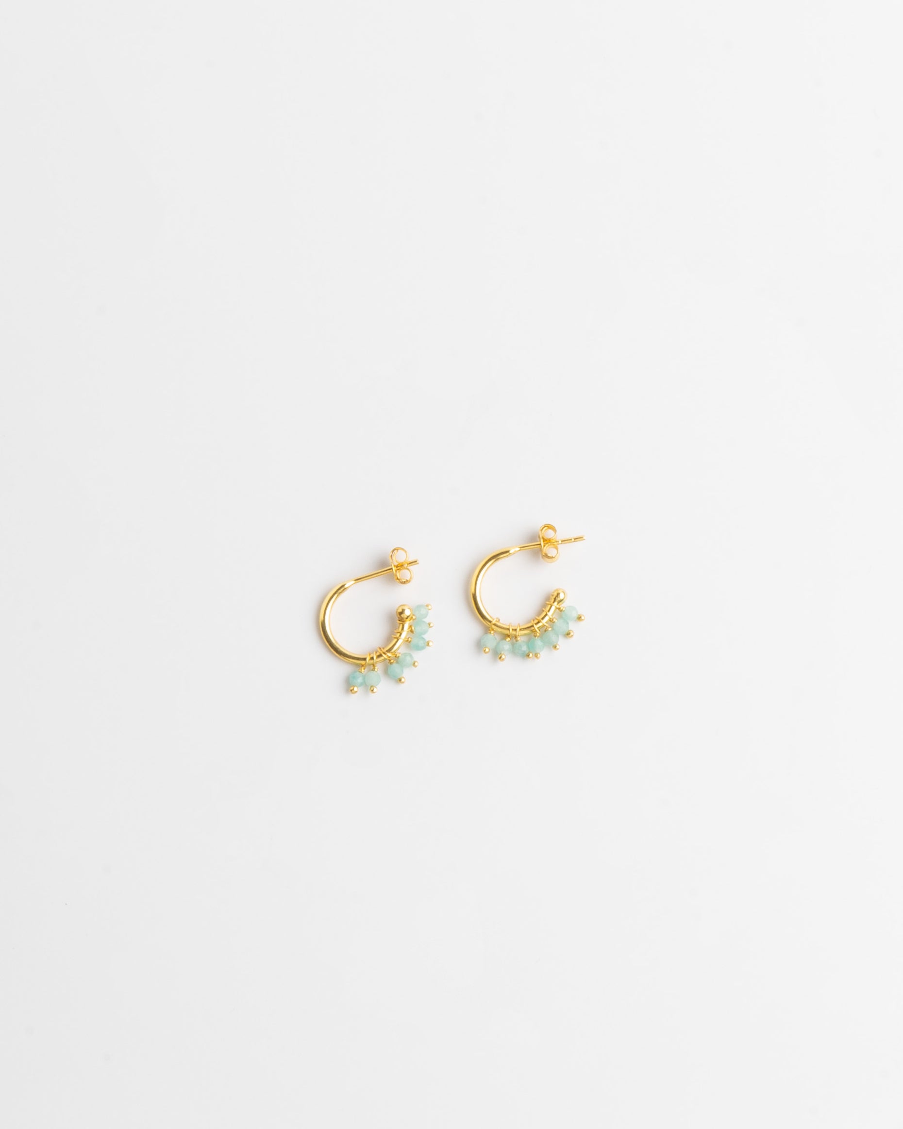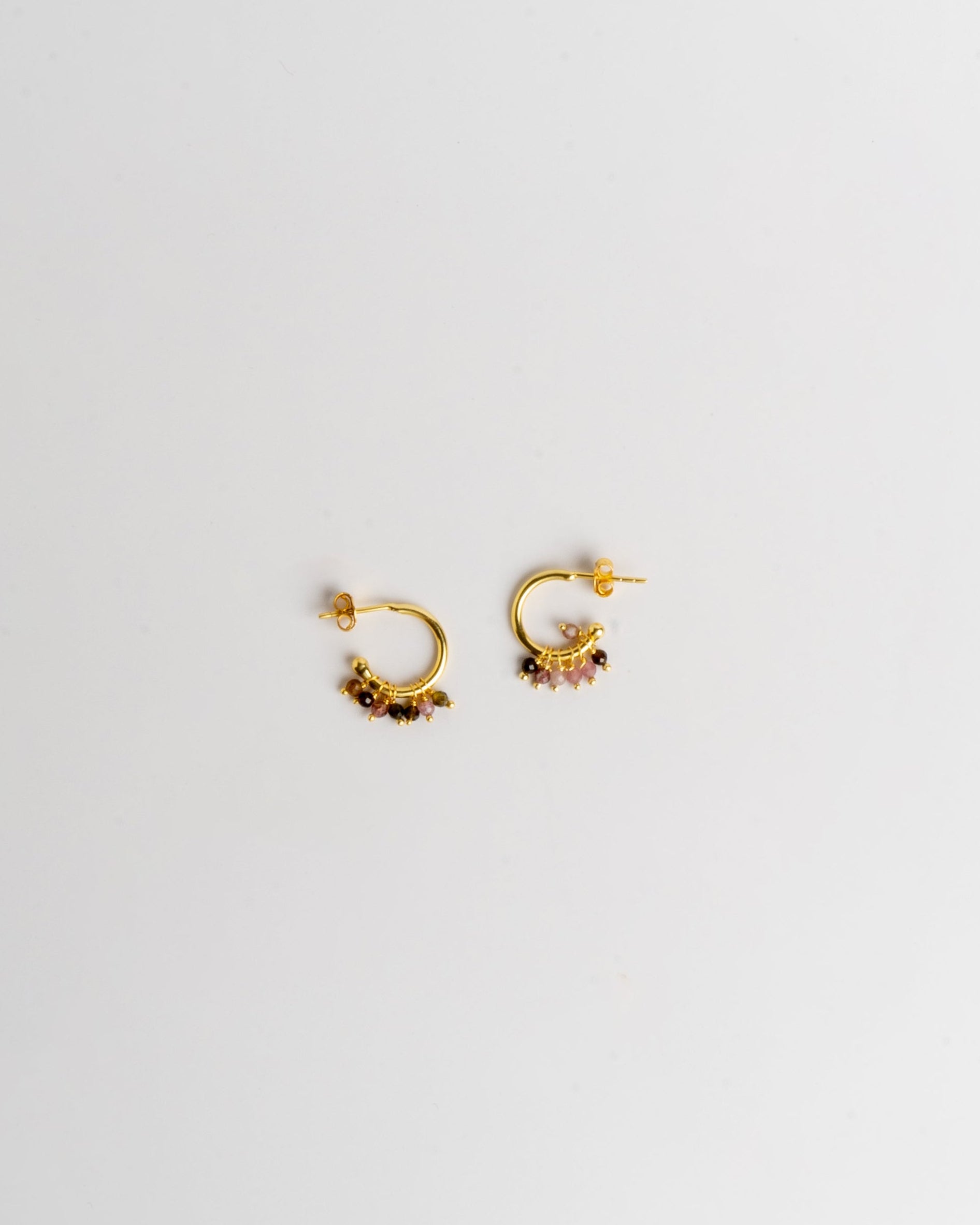 Aros pequeños con cierre de tuerca y detalles en piedras minerales que aportan color y movimiento.
