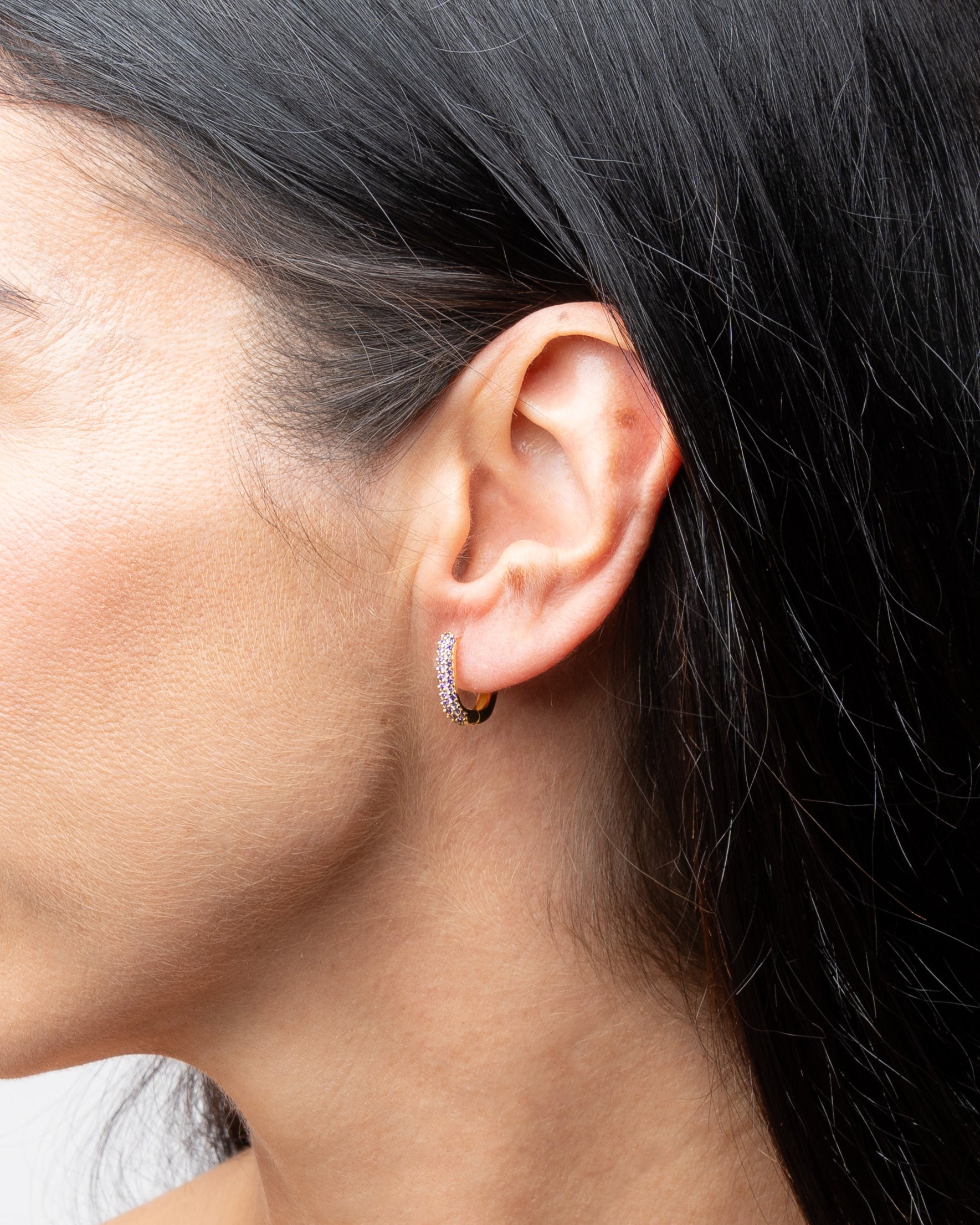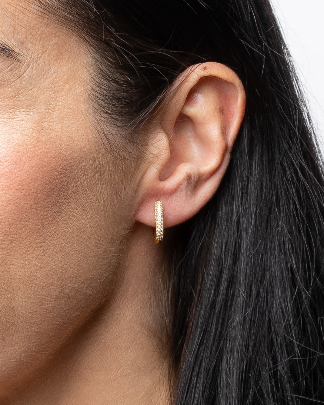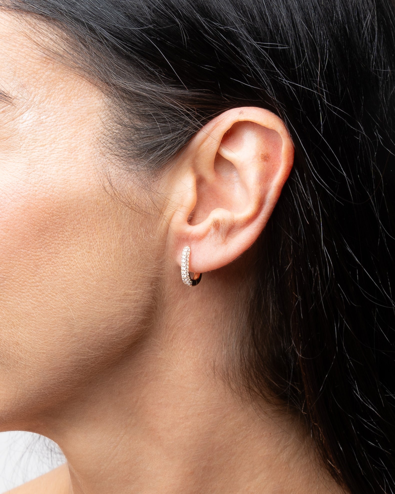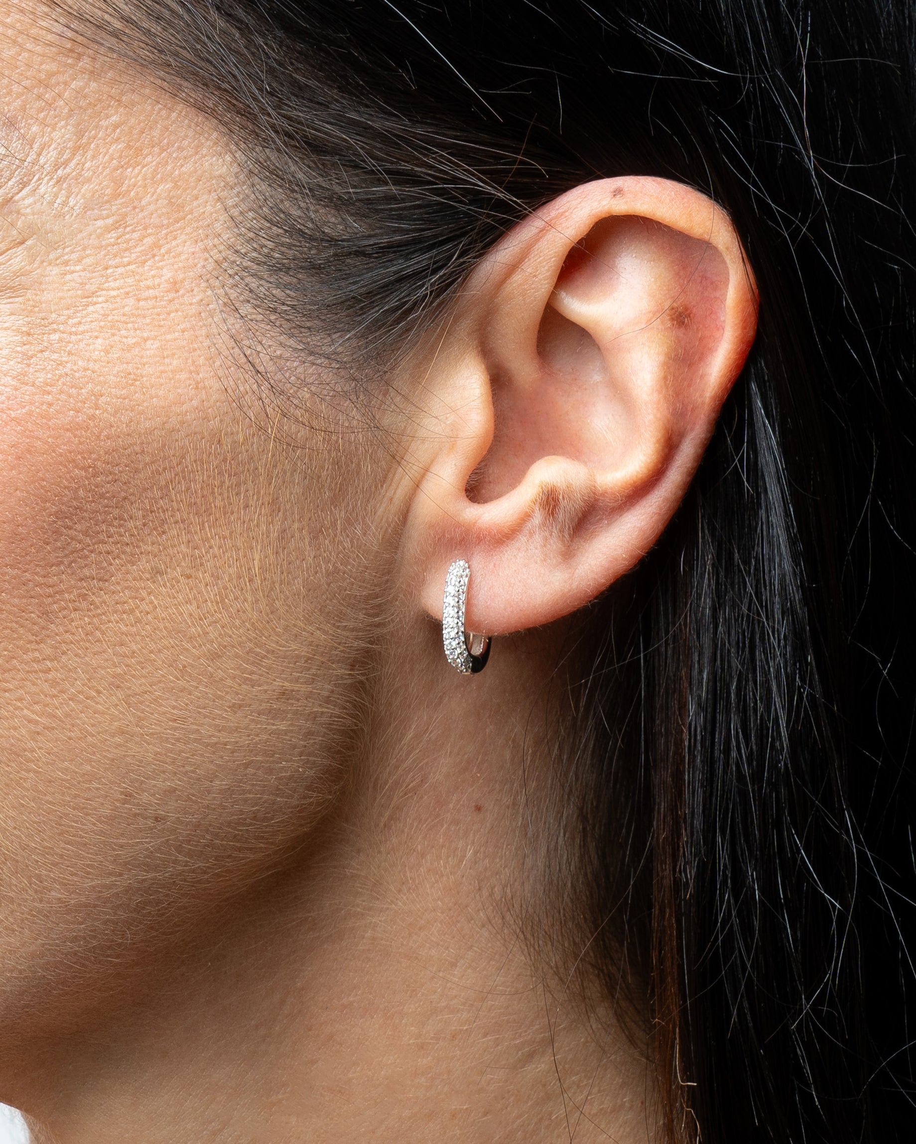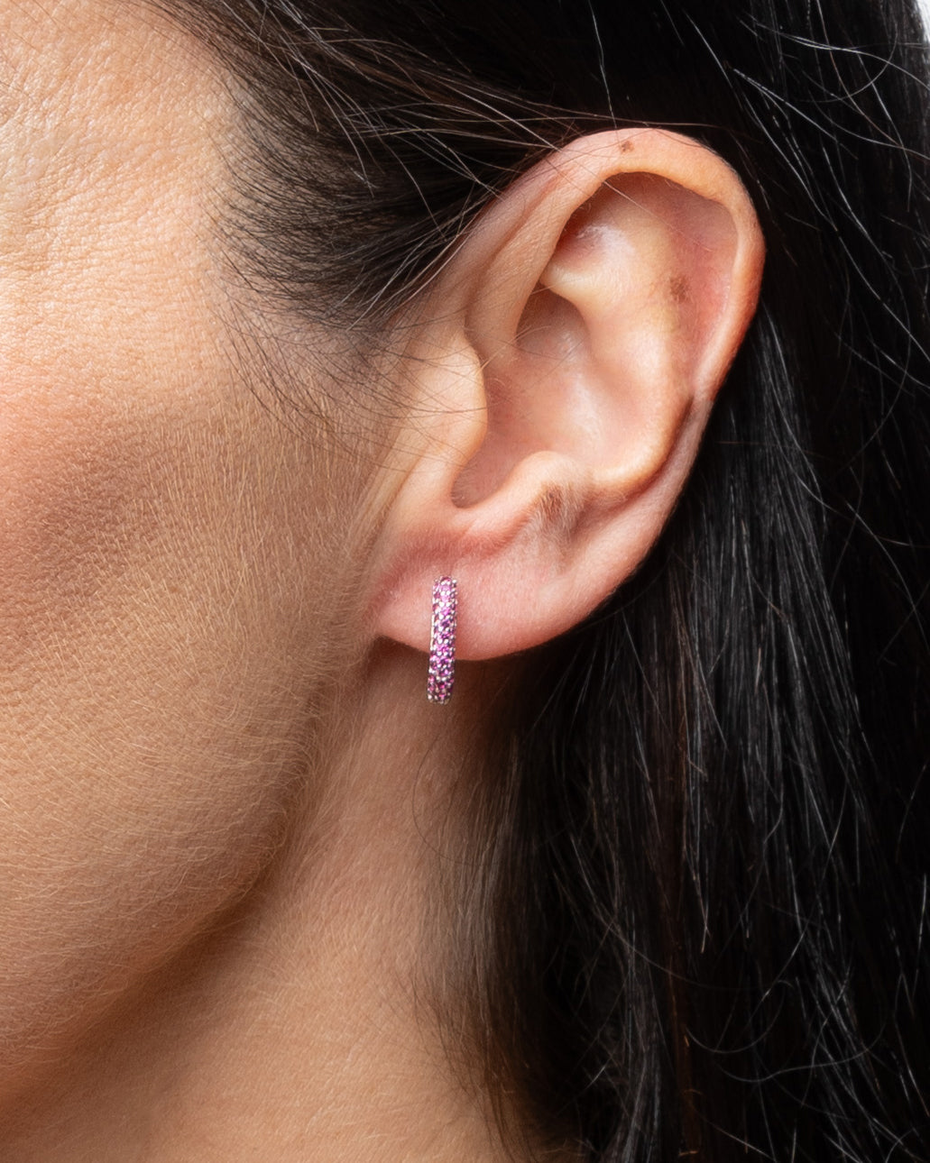 Aros medianos de forma rectangular en plata con circonitas en la parte delantera y acabado liso en la trasera.