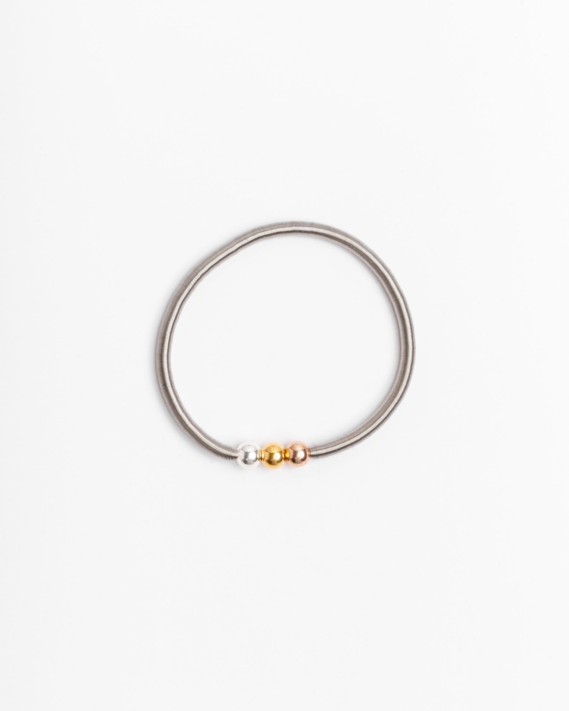 Pulsera de muelle flexible con tres bolas de plata 925 en acabados plata, oro y oro rosa. Cómoda, resistente al agua y muy fácil de poner.
